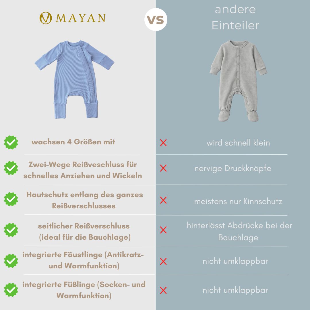 Unser Romper wächst über 4 Größen mit, ist schnell angezogen und bietet maximalen Komfort für Dein Baby. Vom geschützten Reißverschluss bis zu integrierten Fäustlingen und Füßlingen.